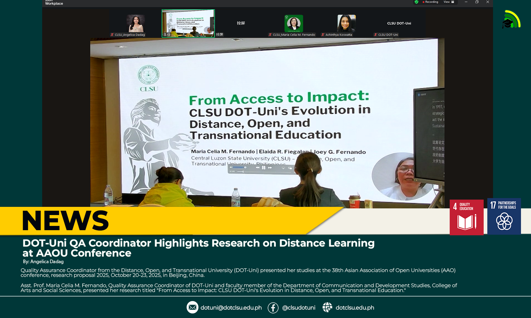 Quality Assurance Coordinator from the Distance, Open, and Transnational University (DOT-Uni) presented her studies at the 38th Asian Association of Open Universities (AAO) conference, research proposal 2025, October 20-23, 2025, in Beijing, China. Asst. Prof. Maria Celia M. Fernando, Quality Assurance Coordinator of DOT-Uni and faculty member of the Department of Communication and Development Studies, College of Arts and Social Sciences, presented her research titled "From Access to Impact: CLSU DOT-Uni's Evolution in Distance, Open, and Transnational Education." Presented online, Asst. Prof. Fernando's study delved into the transformative evolution of CLSU DOT-Uni, emphasizing its continued journey from ensuring access to promoting measurable impact in distance and open education. Her presentation highlighted the multi-phases of DOT-Uni's transformative journey, its learner support system, faculty and student incentive systems, industry collaboration, and responsive programs. It also covered the Graduate Impact Survey overview that evaluates the effectiveness and relevance of DOT-Uni programs. She also underscored the Quality Assurance Framework that anchors DOT-Uni's operations and shared her insights on the future direction of the DOT-Uni toward 2030, envisioning stronger partnerships, global engagement, and sustainable innovation in digital learning. The AAOU Conference is a prestigious gathering of scholars, educators, and practitioners in open and distance education across Asia. This year's event features diverse presentations from various institutions, including the Open University of China, Association Internationale des Universités du troisième Age (AIUTA), Open University UK, Ludwig-Maximilians-University Munich, Hong Kong Metropolitan University, Higher Education Business Group of IFLYTEK, University of China, University of Islamabad Pakistan, K.K. Handiqui State Open University, Open University of Malaysia, Vietnamese Open University, University of the Philippines Open University (UPOU), Universitas Terbuka, the Open University of Sri Lanka, and Hanoi Open University and many other leading universities and research organizations are committed to promoting educational accessibility and excellence through technology and collaboration. CLSU's active participation in this international forum reaffirms its commitment to continuous improvement, global engagement, and educational innovation, through Asst. Prof. Fernando's presentation, DOT-Uni continues to strengthen its reputation as a catalyst for lifelong learning and transformative education in the digital era. #clsudotuni #38thAAOUConferenceResearchPresentation #TransnationalEducation #distanceeducation #distancelearning #lifelonglearning